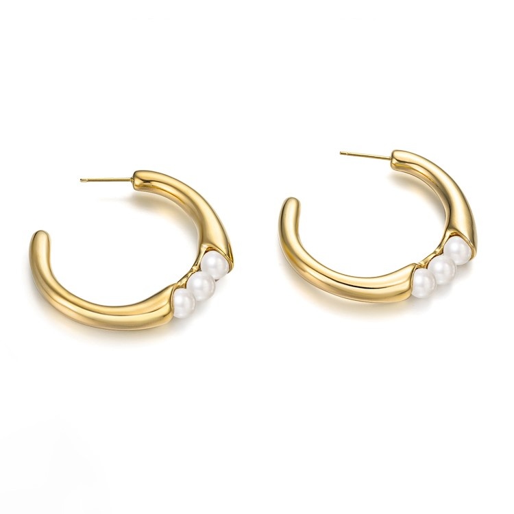 This pair of earrings exudes a unique and charming charm. The C-shaped curve is smooth and elegant, like a gentle embrace, in which three pearls are ingeniously inlaid. The pearls are white and round, exuding a delicate and soft luster, just like the bright stars in the night sky and the crystal dew on the grass in the morning. The three pearls are closely arranged, which not only adds a sense of layering, but also shows a harmonious beauty.