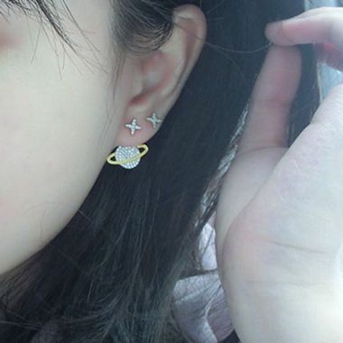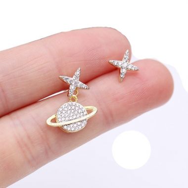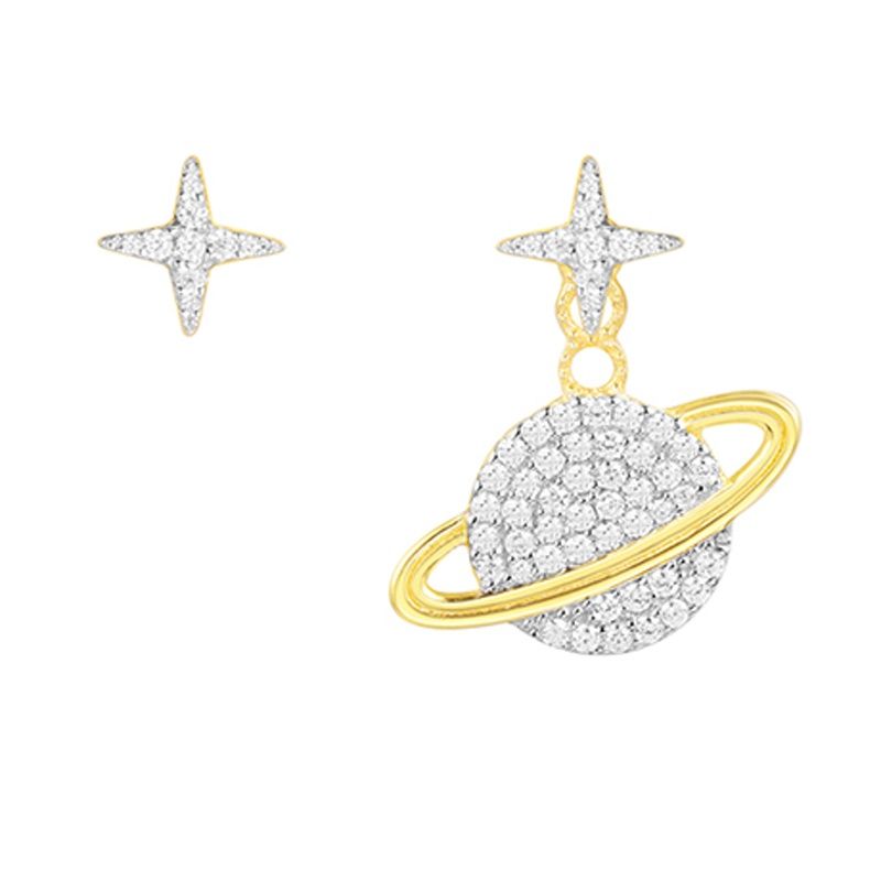 The design of this pair of earrings uses asymmetrical shapes, one is in the shape of a star, and the other is in the shape of a star and a planet, creating an artistic form.